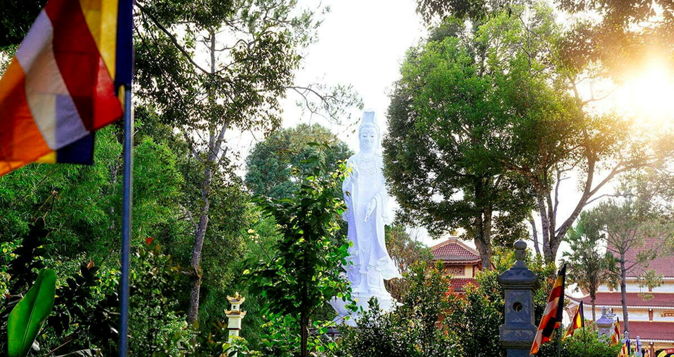 Located in front of the main hall of Khanh Lam Pagoda is a 17m high statue of Bodhisattva Avalokitesvara, surrounded by lush green trees, next to a lotus pond, creating a peaceful and quiet atmosphere.