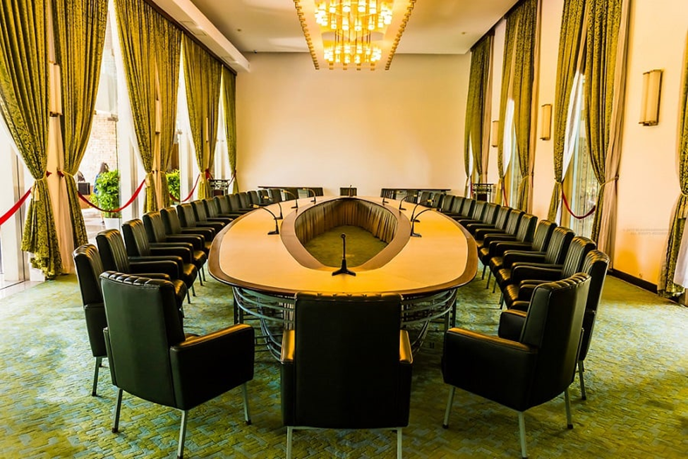 The palace is surrounded by two green parks, one in the front and one in the back. The main structure comprises three floors, two mezzanines, a terrace, a ground floor, and a basement, covering a total area of 20,000 square meters. This space is divided into 100 rooms, each uniquely designed for specific functions with distinct architectural and decorative elements.