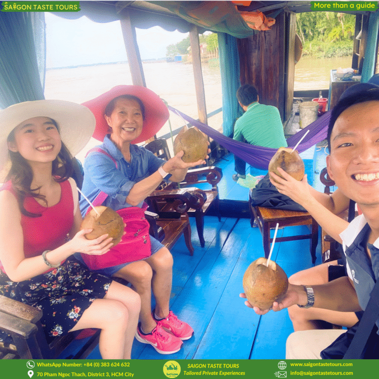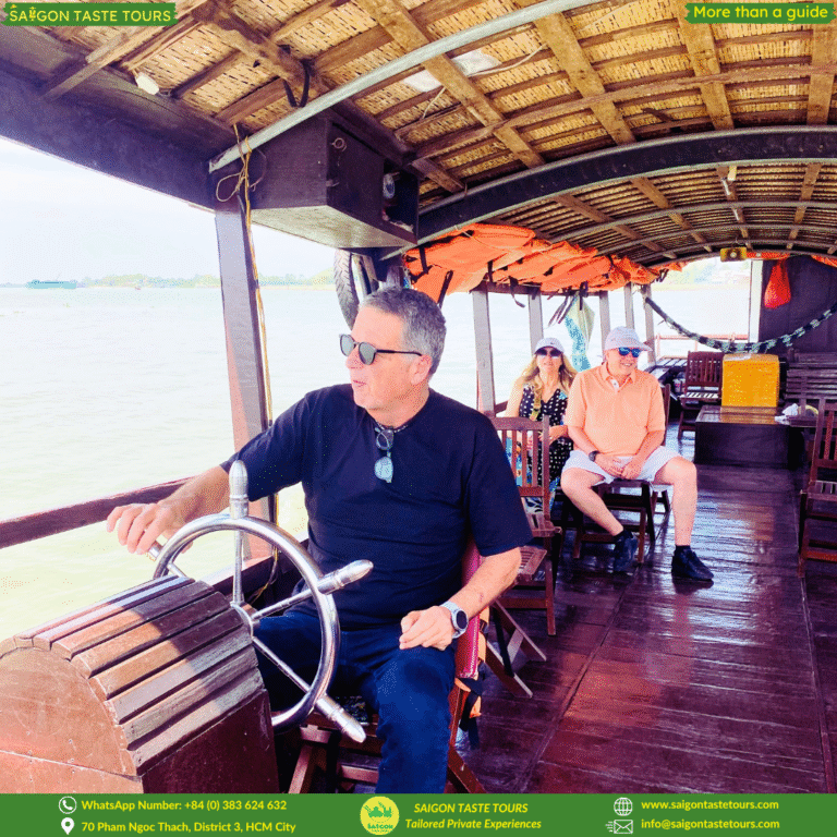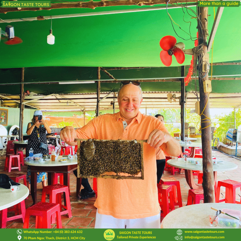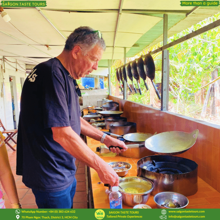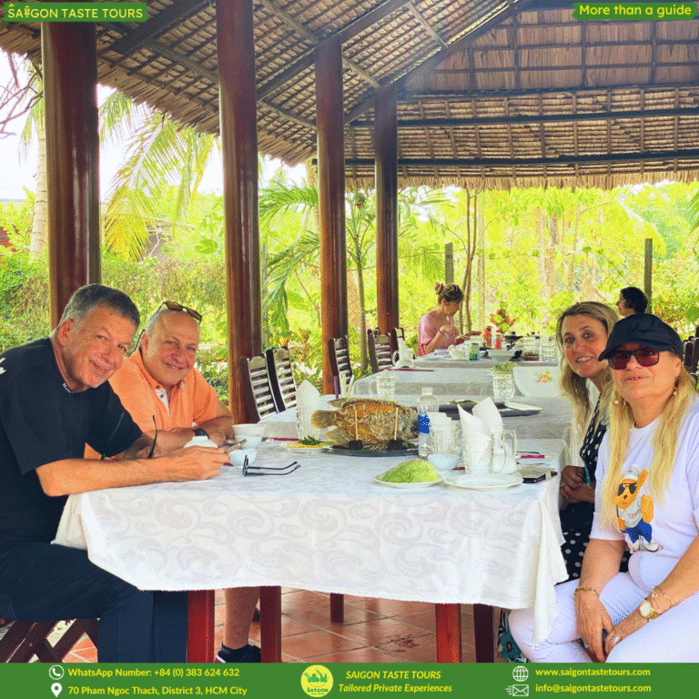 Next, your boat will take you to a beautifully preserved ancient house, offering a glimpse into traditional southern Vietnamese architecture and culture. Here, you’ll join a hands-on cooking session with a local family — learn to prepare Vietnamese dishes and enjoy your homemade lunch in a charming garden setting.