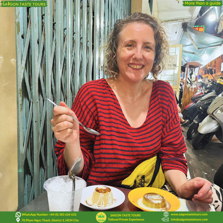 No Vietnamese food tour is complete without something sweet. You’ll finish with a traditional chè – a colorful dessert made with tropical fruits, jelly, beans, and coconut milk – or a silky flan cake topped with black coffee. Finally, we’ll ride to a popular riverside hangout spot, where students and young people gather to enjoy stunning Saigon River views by night.