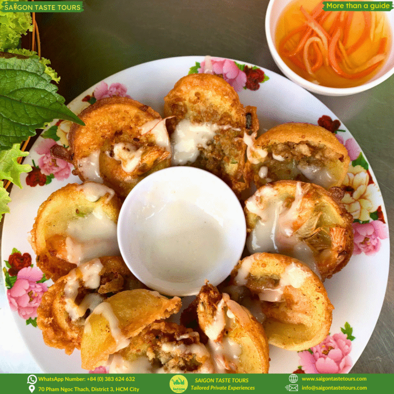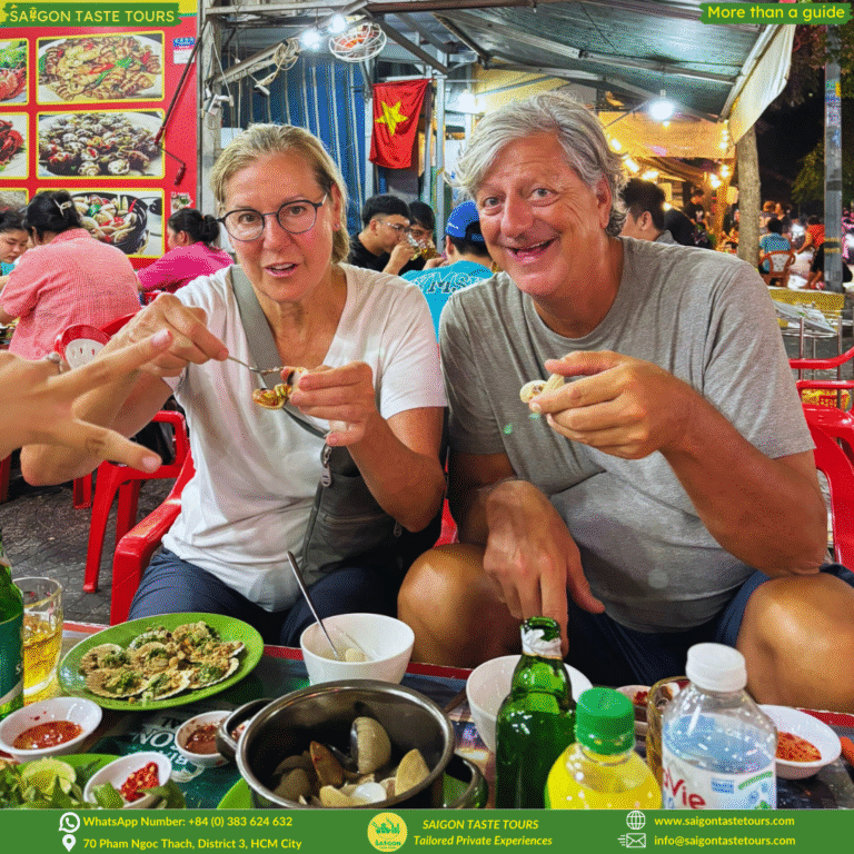 The flavors keep coming in Chinatown, where a steaming clay pot of rich crab noodle soup awaits. Then, venture into Saigon’s legendary “Gangstertown” seafood district, where locals gather late into the night. Feast on grilled scallops topped with peanuts, steamed clams with lemongrass, and smoky pepper-grilled snails, all paired with an ice-cold local beer.