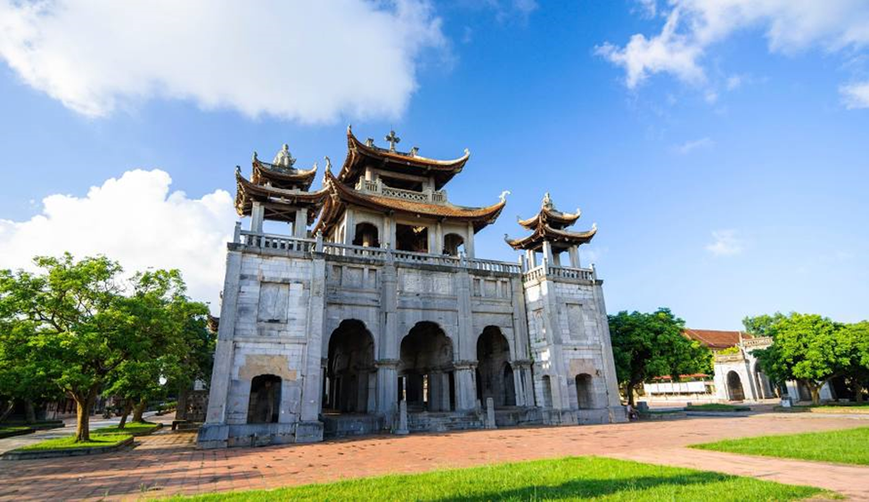 Phat Diem Stone Church stands out for its unique architecture, resembling traditional Vietnamese pagodas despite being a Catholic structure, located 28 kilometers from Ninh Binh city.