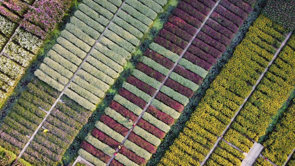 The garden spans a large area of 1.1 hectares, with flowers planted alternately in separate rows. It is beautifully adorned with various decorative elements such as swings and traditional three-plank boats.