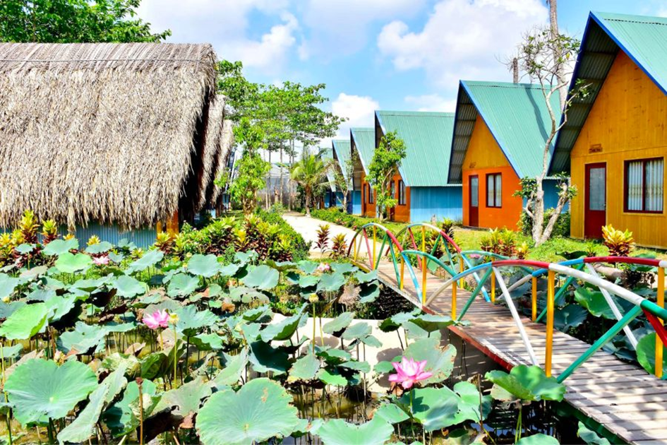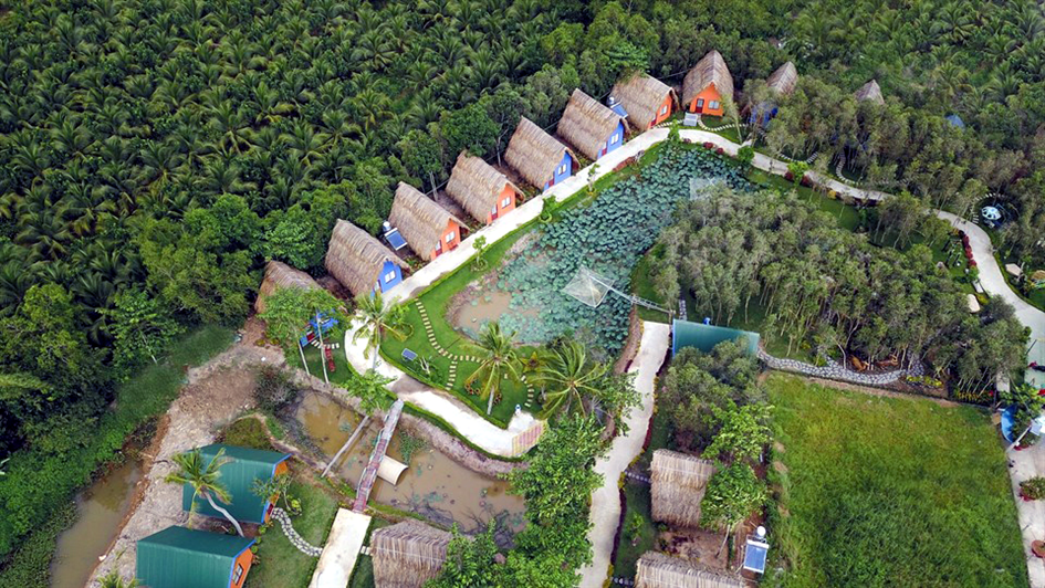 Hoang Hao Ecological Area with a variety of entertainment services suitable for both adults and children, highlights include a homestay on a lotus lake, a swimming pool, a countryside-style restaurant, and traditional waterway games from the Mekong Delta.